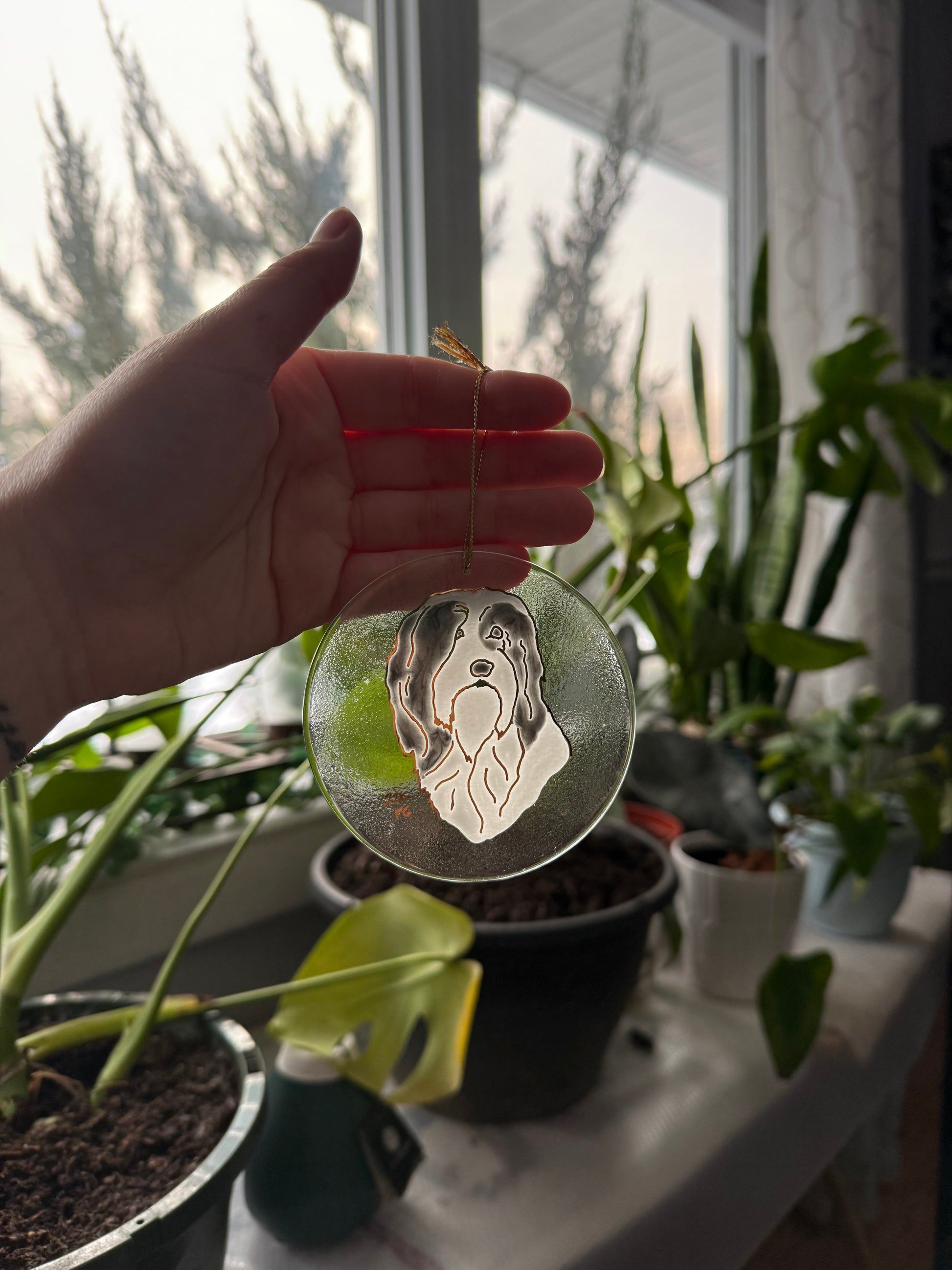 Bearded Collie Dog Sun Catcher Ornament Hand Painted with 22k Gold